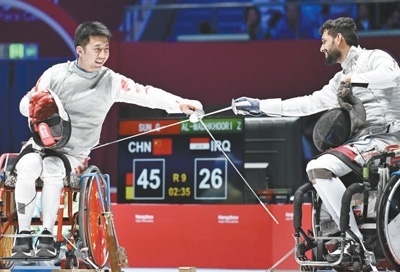 杭州亞殘運會輪椅擊劍男子花劍團(tuán)體金牌賽,中國體育代表團(tuán)運動員孫剛(左)與伊拉克體育代表團(tuán)運動員友好示意。本報記者 王 亮攝