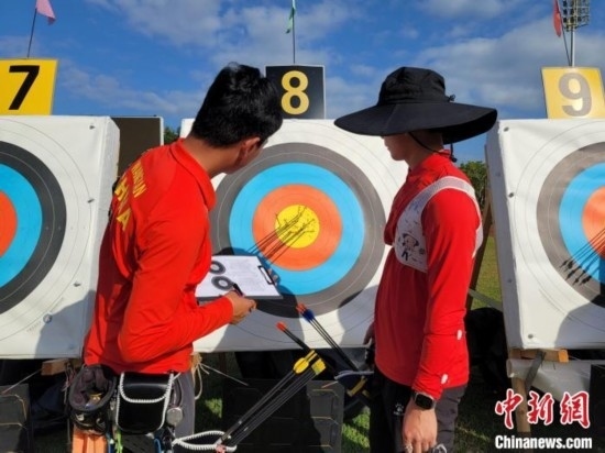 國(guó)家體育訓(xùn)練南方基地(海南白沙·綜合),一輪射箭之后,運(yùn)動(dòng)員在查看中靶情況。中新網(wǎng)記者王曉斌攝