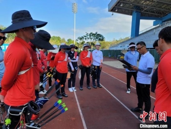 國(guó)家體育訓(xùn)練南方基地(海南白沙·綜合),國(guó)家射箭隊(duì)教練團(tuán)隊(duì)在點(diǎn)評(píng)運(yùn)動(dòng)員當(dāng)日的訓(xùn)練表現(xiàn)。中新網(wǎng)記者王曉斌攝