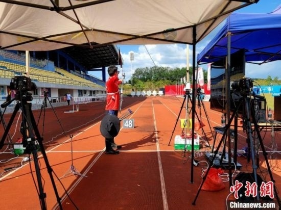 國(guó)家體育訓(xùn)練南方基地(海南白沙·綜合),國(guó)家射箭隊(duì)運(yùn)動(dòng)員在技術(shù)分析靶場(chǎng)練習(xí)。中新網(wǎng)記者王曉斌攝
