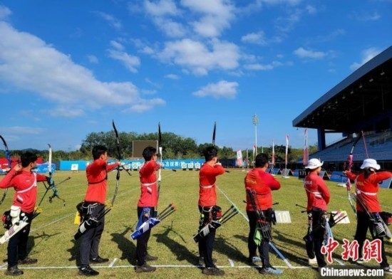 國(guó)家體育訓(xùn)練南方基地(海南白沙·綜合),國(guó)家射箭隊(duì)紅隊(duì)在進(jìn)行一場(chǎng)隊(duì)內(nèi)賽。 中新網(wǎng)記者 王曉斌 攝