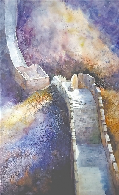 長城歷經(jīng)風(fēng)霜雨雪,形成了大氣蒼茫的自然面貌。呈現(xiàn)長城歷史、傳承長城文化的另一種方式,是發(fā)揮美術(shù)在塑造藝術(shù)形象方面的獨特優(yōu)勢,通過豐富多變的視角和繪畫語言展現(xiàn)長城的滄桑之美與雄渾氣魄。在山西省文化和旅游廳、陽泉市人民政府主辦的“2023印象長城主題文化交流展”上,劉伯務(wù)油畫《屹立千秋》以夕陽下的嘉峪關(guān)長城為表現(xiàn)對象,暖色調(diào)的城墻與遠(yuǎn)處冷色調(diào)的雪山形成對比,突顯“天下第一雄關(guān)”的瑰麗奇?zhèn)ァ@钍懒嶂袊嫛豆湃铩芬匀?lián)畫形式展現(xiàn)夯土長城歷經(jīng)風(fēng)雨依然昂首屹立的景象,并通過色彩變幻反映滄海桑田的歷史變遷。在青海省文化和旅游廳主辦的“長城長 河湟美”青海明長城文化主題采風(fēng)創(chuàng)作系列活動中,美術(shù)工作者多次前往長城沿線體驗生活,抒寫長城古韻,像汪珍系列版畫《長城長 河湟美》等作品,以不同視角、立意、造型,藝術(shù)地表現(xiàn)長城上的時間印記,展示了長城深沉悠遠(yuǎn)的詩意與韻味。