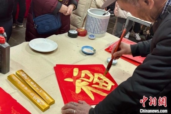 2月10日,大年初一,北京廠(chǎng)甸廟會(huì)開(kāi)門(mén)迎客。圖為書(shū)法家為市民和游客寫(xiě)福、送福。中新社記者 徐婧 攝