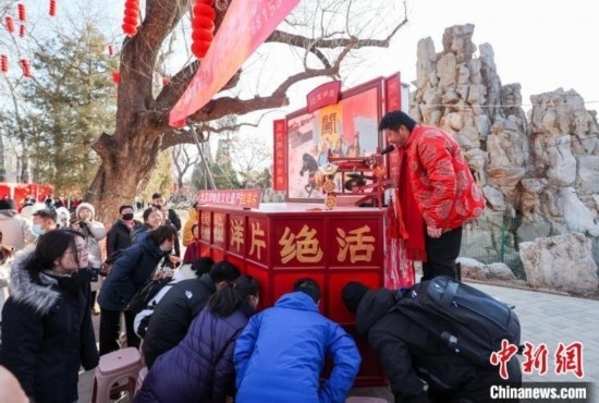 2月10日,大年初一,第三十八屆龍?zhí)洞汗?jié)文化廟會(huì)在北京龍?zhí)豆珗@開(kāi)門(mén)迎客。圖為市民和游客在廟會(huì)上觀看老北京絕活“拉洋片”。中新社記者 賈天勇 攝