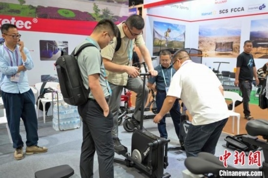 5月1日,采購(gòu)商在廣交會(huì)上嘗試專業(yè)健身器械。中新社記者 陳驥旻 攝