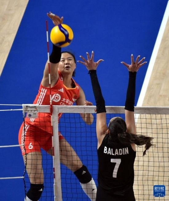 6月15日,中國隊(duì)球員王媛媛在比賽中扣球。新華社記者盧炳輝攝