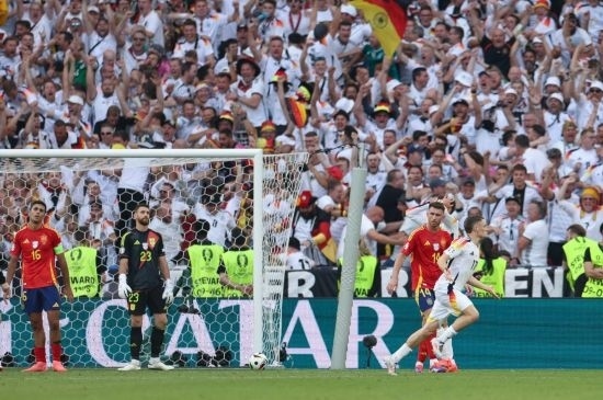 久攻之下,德國隊終于在第89分鐘扳平比分,米特爾施泰特左路傳中,基米希頭球回擺,維爾茨抽射入網(wǎng)。兩隊在常規(guī)時間1:1戰(zhàn)平,比賽進(jìn)入加時賽。第106分鐘,德國隊穆夏拉射門擊中西班牙隊庫庫雷利亞手臂,后者當(dāng)時在本方禁區(qū)內(nèi)防守,但主裁判并沒有判罰點球,VAR(視頻助理裁判)也沒有介入。