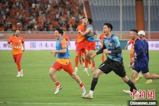 山東泰山隊點球大戰(zhàn)取勝,隊員沖進場內(nèi)慶祝。中新社發(fā) 陳陽 攝