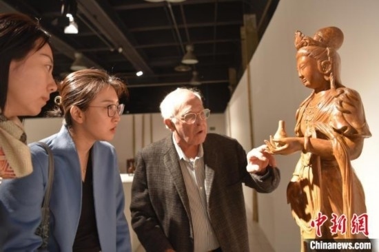 當?shù)貢r間8月12日,巴西圣保羅州坎皮納斯市,“中國藝術五千年 塞奎拉·萊特收藏”啟幕。圖為巴西文物修復師毛羅·里貝羅(右一)講解如何修復木雕觀音像。中新社記者 林春茵 攝