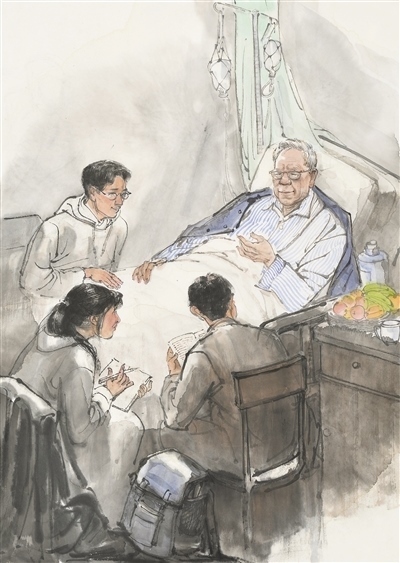 人民教師勤學篤行、求是創(chuàng)新的躬耕態(tài)度,給無數人以榜樣的力量,也給美術創(chuàng)作以靈感?!叭嗣窠逃摇眹覙s譽稱號獲得者衛(wèi)興華,終其一生都奮斗在勤學求真的道路上。90余歲時,即使病痛纏身,他仍堅持每天學習、工作。有感于衛(wèi)興華教授的敬業(yè)精神,高毅特意描繪了臥病在床的衛(wèi)興華堅持與學生探討學術課題的場景,主人公那專注的神情令人動容。像衛(wèi)興華這樣堅守耕耘的教師還有許多。劉昌明水彩畫《一個教師的工作臺》便以細致的場景描繪表達出對教師群體的敬意。貼著泛黃舊紙的墻面、藥瓶和墨水瓶之間的教案、脫漆的木桌、一副老花眼鏡……畫家在此調動了一切能夠反映老一輩教育者辛勤伏案的元素,象征著沒有直接出場的教師形象?!按颂師o聲勝有聲”的表達效果,令人回味無窮。