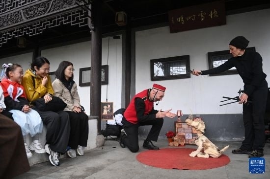 10月27日,來自意大利的藝術(shù)表演者在南潯古鎮(zhèn)宜園為游客表演輕喜偶劇。
