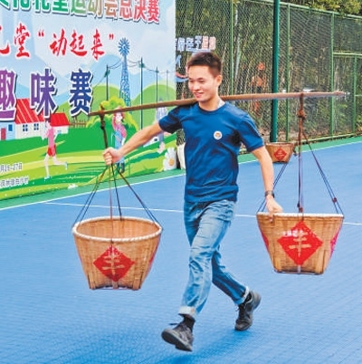在白沙村舉辦的浙江省農村文化禮堂運動會總決賽上,村民參與挑扁擔比賽。
