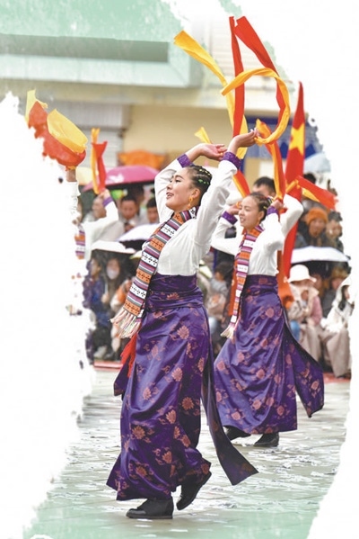 春節(jié)假期,每到傍晚時(shí)分,四川省阿壩藏族羌族自治州若爾蓋縣城中心的北上廣場(chǎng)都會(huì)準(zhǔn)時(shí)響起歡快的鍋莊曲,遠(yuǎn)道而來(lái)的游客與當(dāng)?shù)厝罕娨黄鹛饸g快的鍋莊。伴著音樂(lè),鮮艷的長(zhǎng)袖在風(fēng)中劃出道道弧線,腰飾隨著舞步搖曳,男女老少圍成一圈、翩然起舞。