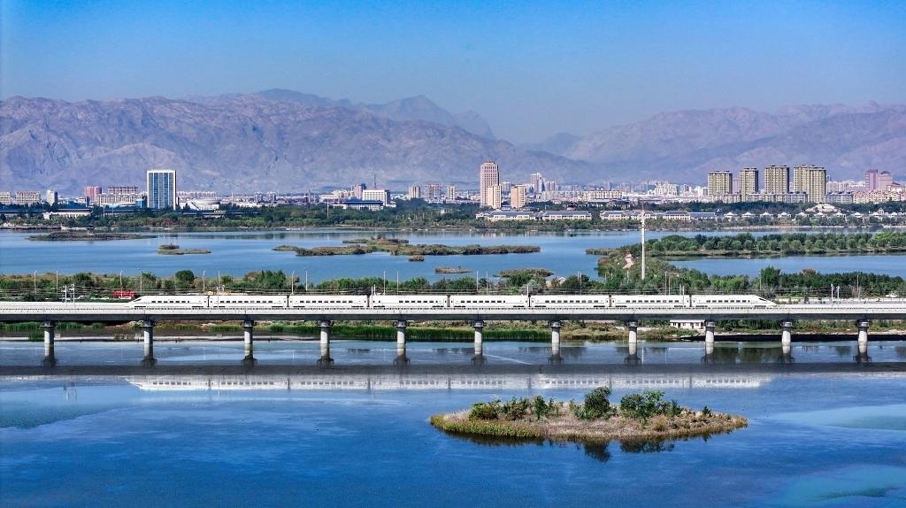 2024年10月3日,一列動車組列車行駛在包銀高鐵惠銀段石嘴山特大橋上(無人機照片)。新華社記者馮開華攝