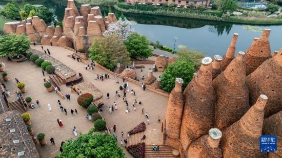 人們?cè)谠颇鲜〖t河州彌勒市東風(fēng)韻小鎮(zhèn)游玩(無(wú)人機(jī)照片,4月5日攝)。