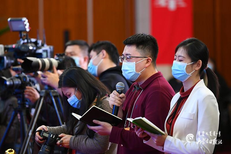 1月27日晚,自治區(qū)十三屆人大四次會議“代表通道”集中采訪活動在內(nèi)蒙古人民會堂玻璃廳舉行,8位人大代表分兩組“亮相”。這是自治區(qū)人大首次開通“代表通道”。圖為人民網(wǎng)記者在提問。內(nèi)蒙古日報(bào)記者 金泉 攝