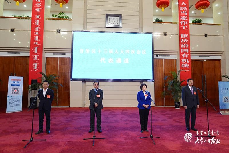 1月27日晚,自治區(qū)十三屆人大四次會議“代表通道”集中采訪活動在內(nèi)蒙古人民會堂玻璃廳舉行,8位人大代表分兩組“亮相”。這是自治區(qū)人大首次開通“代表通道”。圖為人大代表樸成奎、胡成東、云霖瓊和李全文4位代表(從左至右)回答記者提問。內(nèi)蒙古日報(bào)記者 金泉 攝