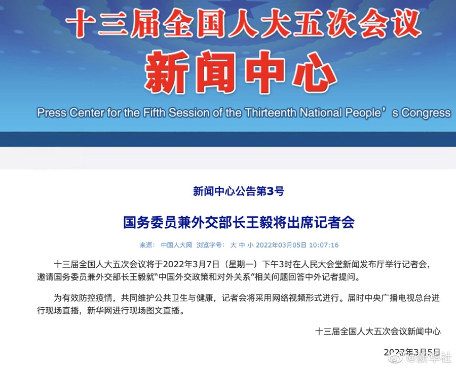 十三屆全國人大五次會議將于3月7日(星期一)下午3時在人民大會堂新聞發(fā)布廳舉行記者會,邀請國務委員兼外交部長王毅就“中國外交政策和對外關系”相關問題回答中外記者提問。