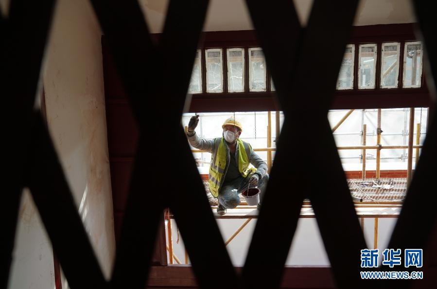 2021年1月14日,工人在修繕現(xiàn)場(chǎng)施工。2020年11月17日起,中共一大會(huì)址及原展廳暫停對(duì)外開放實(shí)施修繕改造。新華社記者 劉穎 攝