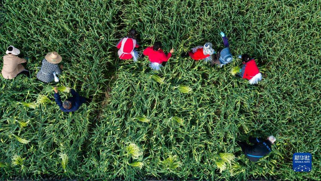 在成都市溫江區(qū)永寧街道八角社區(qū),農(nóng)民在蒜稻輪作田里采收蒜薹(3月23日攝,無(wú)人機(jī)照片)。新華社記者 沈伯韓 攝